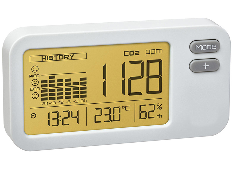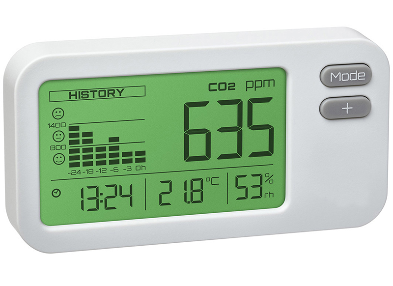 Handig toestel voor het toezicht op de CO2-concentratie in gebouwen waar mensen samen komen. Digitale weergave van de CO2-concentratie en een 24-uursgrafiek. Een verlichtingskleur toont het CO2-niveau, alarm of gewenste kleur. Eveneens weergave van de tijd, binnentemperatuur en de luchtvochtigheid.