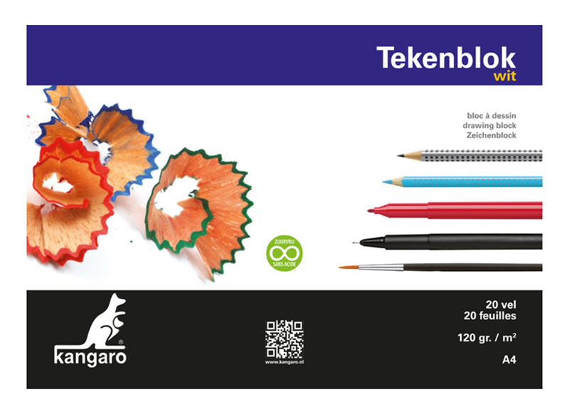 Tekenblok Kangaro 210x297mm eenzijdig gelijmd, 120grams wit papier 20 vel. Toepasbaar voor potlood, tekenpotlood, stiften. Zuurvrij papier.