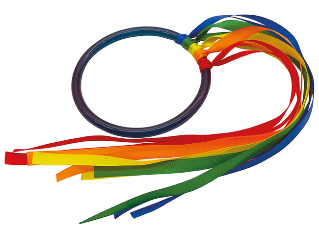 | Samenstelling | Set van 24 ringen + 120 linten van 80 cm in 5 verschillende kleuren. Indien ieder kind 2 ringen gebruikt, kunnen dus 12 kinderen tegelijk met deze ritmieklinten spelen. |
