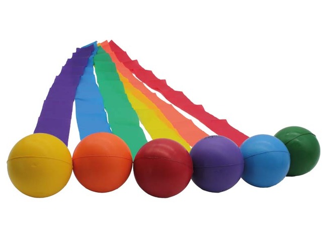 Set van zes ballen in diverse kleuren met een 'staart' van 46 cm. De kleur van de bal en de afwijkende staart maken het makkelijk de bal te volgen door de lucht.
