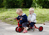 Een loopfiets zonder pedalen en met een passagierszitje dat het rollenspel van kinderen stimuleert. De dubbele voorwielen helpen het evenwicht te bewaren. De passagier houdt zich vast aan de stang.