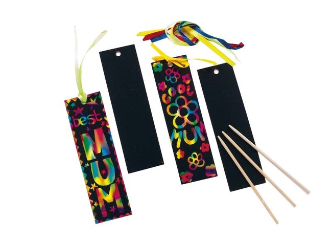 | Omschrijving | Geef deze bladwijzers een persoonlijke touch door de zwarte laag weg te krassen en zo een decoratie te maken in de verschillende kleuren van de regenboog. |