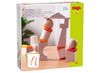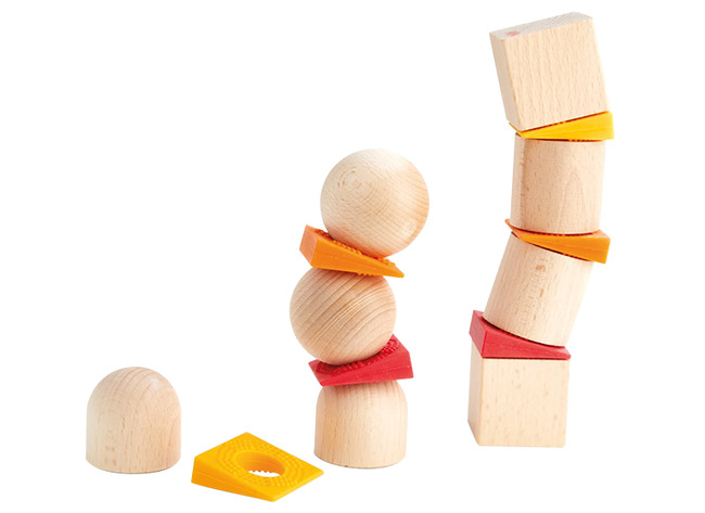 Een grappig, 3D compositiespel met speciale onderdelen om scheve torens te maken met behulp van houten ballen.