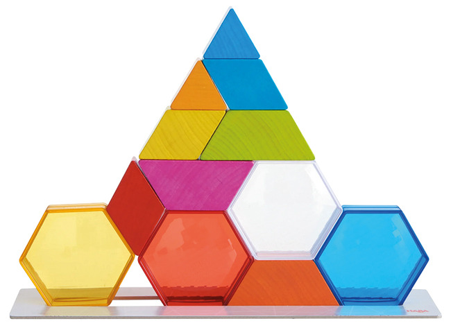 De blokken en prisma's door elkaar of juist netjes en geometrisch opgestapeld volgens één van de uitdagende voorbeeldkaarten: dit kleurrijke stapelspel biedt talrijke, creatieve mogelijkheden voor de kleine stapelkunstenaars. De prisma's en houten blokken kunnen in het stapelframe op elkaar worden gestapeld, maar de bouwstenen kunnen ook plat neergelegd worden om vormen en patronen te maken. De prisma's bovendien geven een interessant, fonkelend effect door vanuit verschillende hoeken te kijken. Een uitdagend, speels en vrolijk gekleurd stapelspel voor langdurig en gevarieerd speelplezier! Met 12 dubbelzijdig bedrukte voorbeeldkaarten in 3 moeilijkheidsniveausde voor nóg meer plezier en uitdaging. Het spelen, schuiven, leggen en bouwen met dit stapelspel en de geometrische vormen stimuleert de fijne motoriek, het ruimtelijke voorstellingsvermogen, de fantasie en creativiteit. |