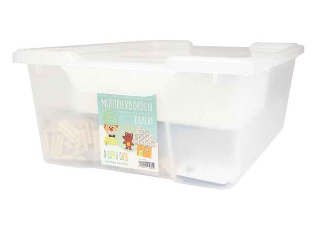 | Kenmerken | De motoriekborden zijn gemaakt uit afwasbaar kunststof. Kist en deksel in stevig kunststof. |