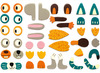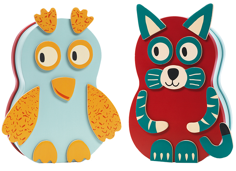 | Samenstelling | 41 magnetische houten stukjes in verschillende vormen en kleuren (ogen, staarten, oortjes, snuiten enz.). Verpakt in een metalen doos. |