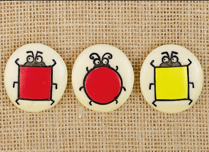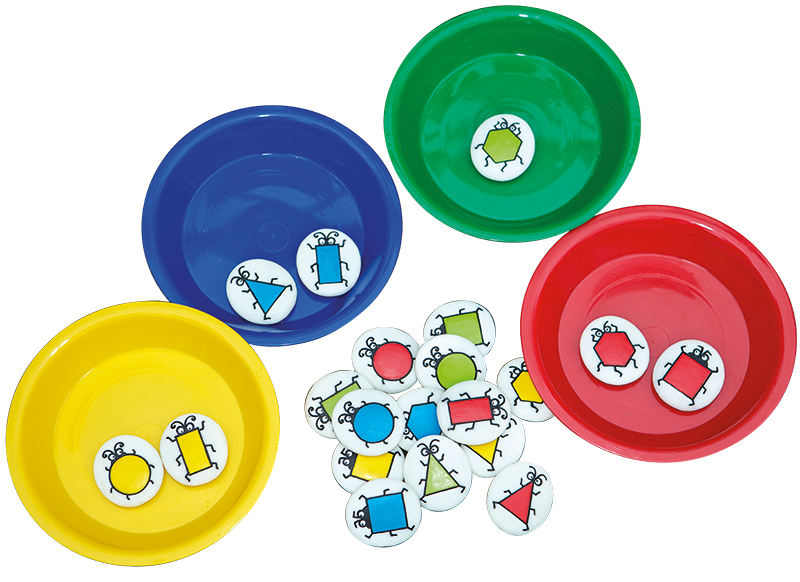| Samenstelling | Elke set bevat 20 stenen met vijf vormen - cirkel, vierkant, rechthoek, driehoek en zeshoek - in vier kleuren: rood, blauw, geel en groen. |