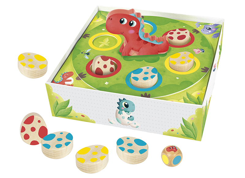 | Samenstelling | Spelbord, mama-dino, 9 eieren, 1 dobbelsteen. |