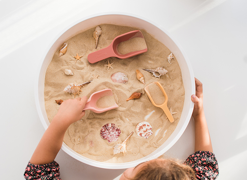 Deze 3 zachte en buigzame schepjes zijn ideaal voor het scheppen van materialen zoals rijst, parels en vloeistoffen. Perfect om te combineren met de PlayTRAY.