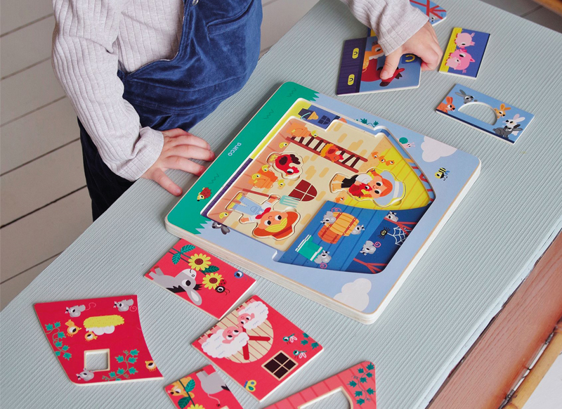 Ontdek het boerderijleven met deze 3-lagen puzzel! Kinderen verkennen elke laag en leren over dieren in de stal.