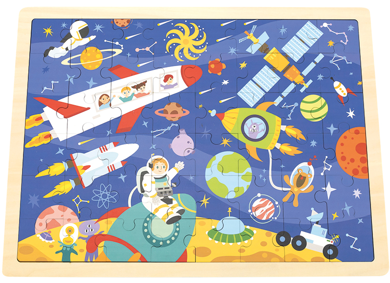 Ga mee op ruimtereis met deze kleurrijke puzzel van 48 houten stukjes! Ontdek raketten, planeten en sterren terwijl je speelt en leert.