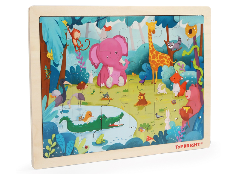 Puzzel in het thema jungle met vrolijke kleuren die de aandacht van kinderen trekken.