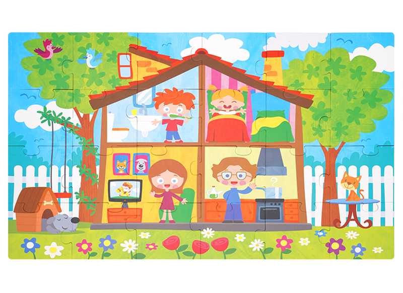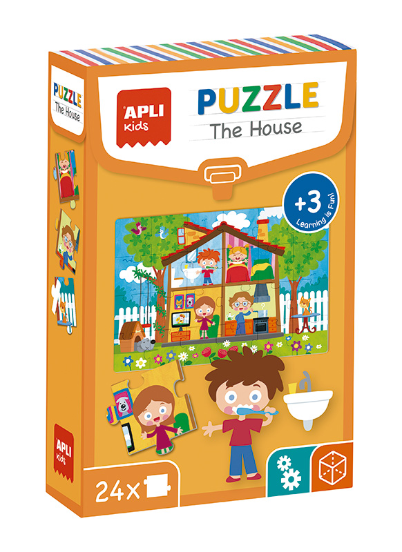 Deze puzzel is een kleurrijke, leerzame legpuzzel waarmee jonge kinderen op ontdekkingstocht gaan door een huis. Van de slaapkamer tot de keuken: elke kamer bevat herkenbare objecten die uitnodigen tot benoemen, vergelijken en verhalen verzinnen. Deze puzzel stimuleert spelenderwijs de woordenschat, taalontwikkeling en visuele waarneming. "Waar zie je het bed?", "Wat hoort er in de badkamer?" – zo wordt puzzelen ook een taalrijke activiteit. De grote, stevige puzzelstukken zijn makkelijk vast te nemen voor kleine handjes, wat bijdraagt aan de ontwikkeling van de fijne motoriek. Dankzij de duidelijke illustraties is de puzzel ideaal voor kinderen die leren over thema’s als dagelijks leven, wonen en het eigen lichaam verzorgen. |