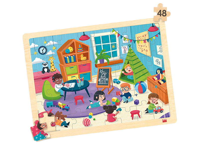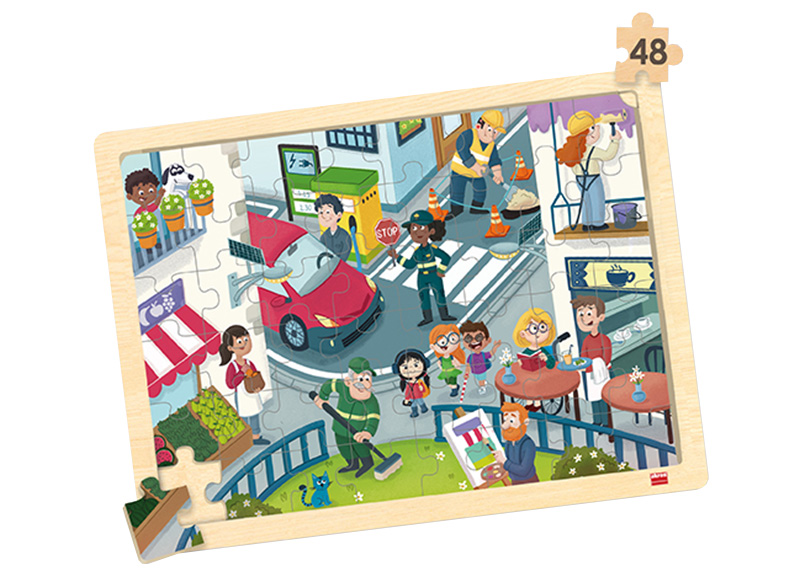 Deze prachtige set van 4 houten inlegpuzzels van Akros neemt kinderen mee op verkenningstocht door hun eigen leefwereld. Elke puzzel bestaat uit 48 stevige stukjes en toont herkenbare situaties uit het dagelijks leven – denk aan de supermarkt, het park, school of thuis. Dankzij de duidelijke illustraties en het realistische ontwerp worden observatie- en taalvaardigheden volop gestimuleerd. Kinderen herkennen wat ze zien, benoemen het, leggen verbanden én oefenen tegelijkertijd hun fijne motoriek en logisch denken. Het inlegontwerp geeft extra steun bij het puzzelen: de stukken passen mooi in de vorm, wat zorgt voor overzicht en rust tijdens het spel. Ideaal voor ontdekhoeken of thematafels rond ‘mijn omgeving’, beroepen of sociale interacties. |