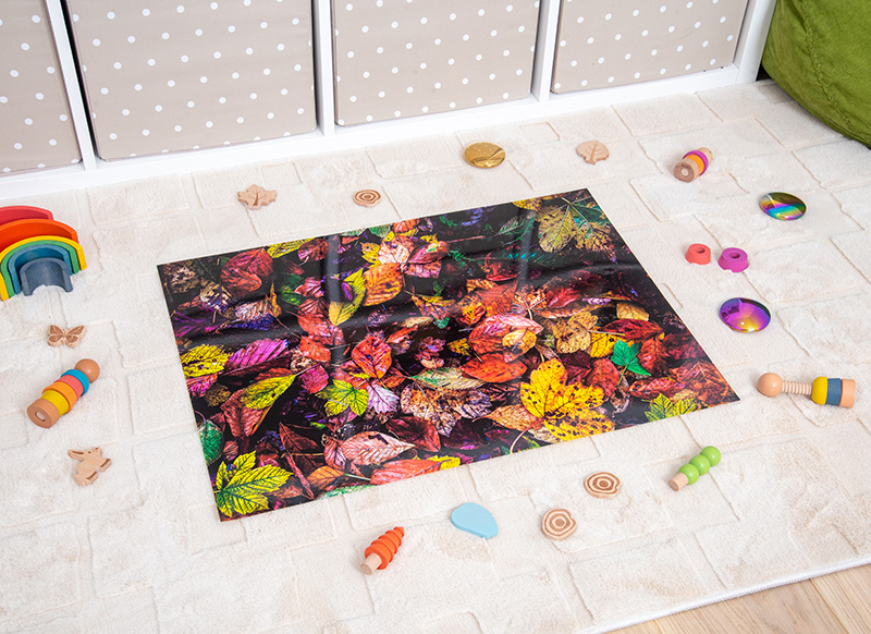 Breng de herfst tot leven met deze realistische speelmat vol kleurrijke bladeren. Perfect voor sensorisch spel, thematafels of als sfeervolle ondergrond.
