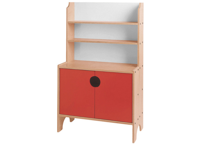 | Samenstelling | Het bovenste deel bestaat uit 2 legplanken waarop de bordjes verticaal uitgestald kunnen worden. De roodgelakte deurtjes in het onderste gedeelte kunnen dankzij de uitsparingen vlot en zonder gevaar van geklemde vingertjes geopend worden. |