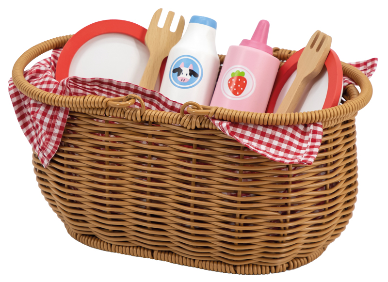 | Kenmerken | Mandje vervaardigd uit kunststof, voedingswaren vervaardigd uit hout en lakentje vervaardigd uit textiel. |