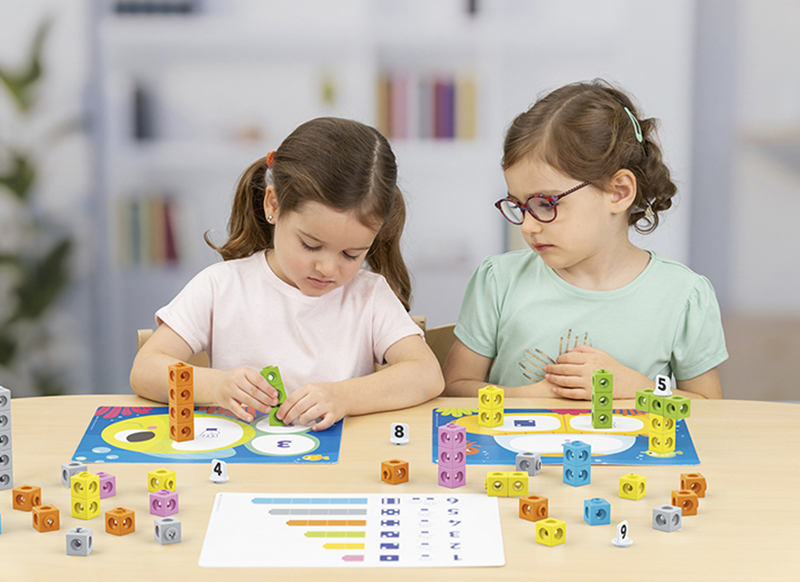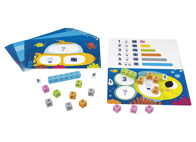 Speels en visueel rekenmateriaal waarmee jonge kinderen leren hoe getallen zijn opgebouwd en gesplitst. Via kleurige blokjes, activiteitskaarten en getalvlaggetjes ontdekken ze hoe je getallen tot 6 op verschillende manieren kunt samenstellen en weer uit elkaar halen. De set bevat 24 stevige kaarten, verdeeld in 4 niveaus, die stapsgewijs oplopen in moeilijkheid. Elke opdracht vraagt om een specifieke bouwactie met blokken, waarbij kinderen steeds het aantal controleren, vergelijken of aanvullen. Er zijn activiteiten rond getallen samenstellen (compositie) én splitsen (decompositie). Denk aan: "Wat ontbreekt om 6 te maken?". |