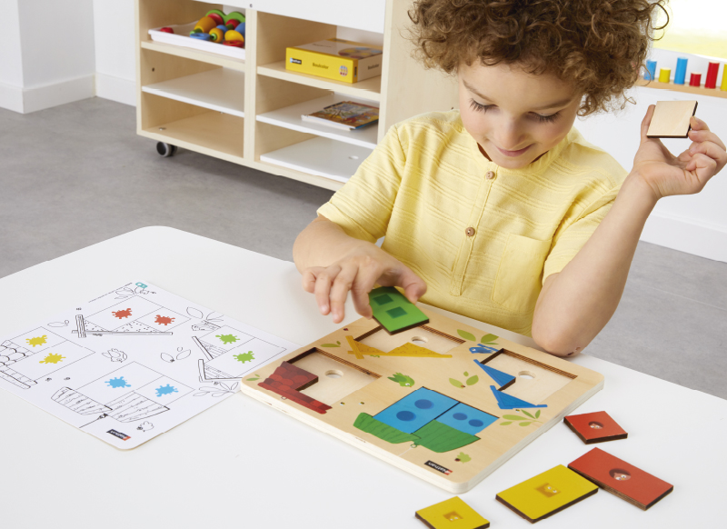 Dit zelfcorrigerende spel biedt 2 speelse puzzels om vorm-en kleurherkenning bij kinderen te stimuleren. Kinderen raken vertrouwd met de mogelijkheden van de hutfronten en verwerven nieuwe woordenschat van vormen (vierkant, rechthoek, cirkel), maten (klein, groot,…) en posities (op, onder, naast…). De 12 dubbelzijdige opdrachtkaarten hebben 6 reeksen met oplopende moeilijkheidsgraad. De oplossing van een opdracht kan je terugvinden op de keerzijde van elke kaart. Bevordert vaardigheden zoals: kleur-en vormherkenning, observerend vermogen, ruimtelijke oriëntatie en kennismaking met ruimtelijke begrippen. |
