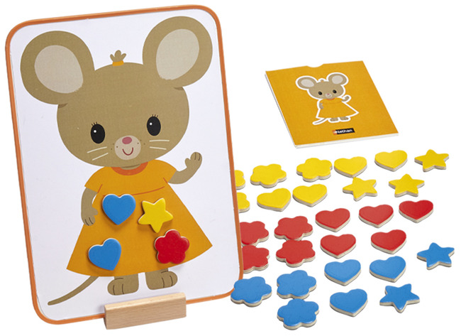 | Samenstelling | 1 handleiding, 15 dubbelzijdige modelkaarten, 36 activiteitenfiches, 2 kartonnen hoesjes, 2 dubbelzijdige magneetborden, 2 houten sokkels, 45 magnetische jetonnen in 3 verschillende vormen en 3 verschillende kleuren. |