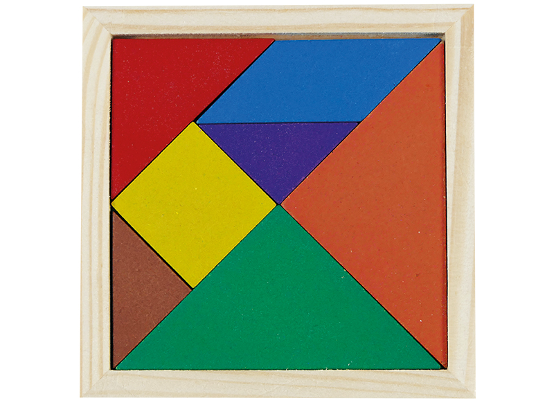 Houten tangram in 7 stukken met elk een verschillende kleur.