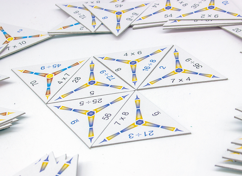 | Omschrijving | Leerlingen verbinden bewerkingen met hun uitkomst door de kaarten aan elkaar te schakelen. Aan elke zijde van de driehoek past een kaart. Het volledige patroon kan enkel kloppen wanneer alle bewerkingen op de juiste manier in de puzzel zijn gelegd. Elke set heeft 2 spellen met kaarten die aan beide kanten bedrukt zijn. De leerlingen kunnen zelf controleren of hun ‘puzzel’ al dan niet correct is opgelost. De kaartjes zijn vervaardigd in stevig gelamineerd karton. Leerlingen oefenen volop op het vermenigvuldigen en delen van getallen tot 100. |