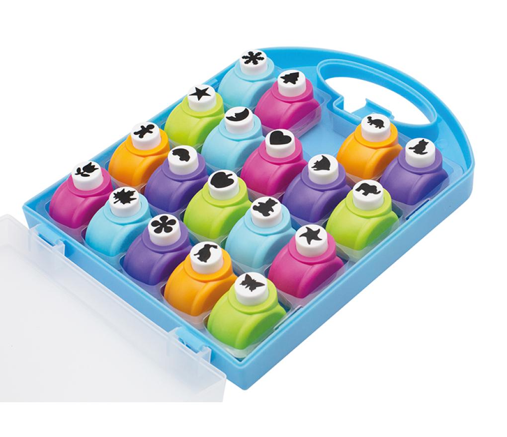 19 kleine perforators van O’Color in vrolijke vormen, handig opgeborgen in een koffer. Perfect voor creatief knutselen met papier en karton tot 160g/m².