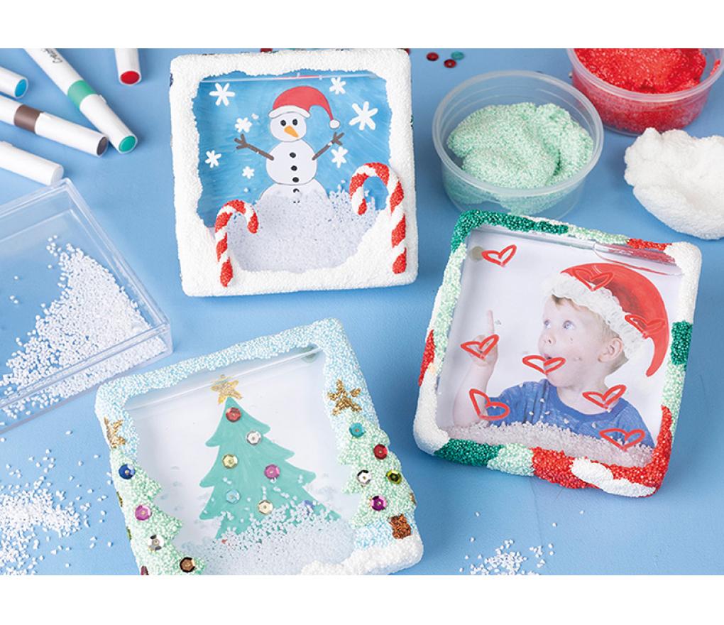 Vierkant transparant lijstje met sneeuwvak en ruimte voor een foto of tekening. Met rubberen stop en inclusief sneeuw. Stimuleert creativiteit en fijne motoriek.