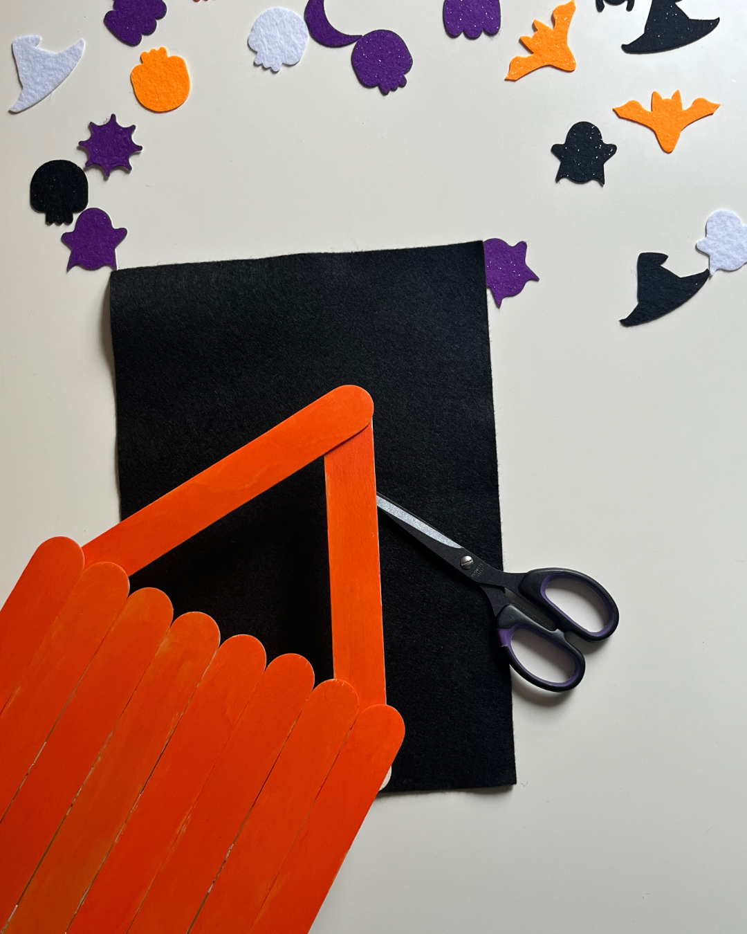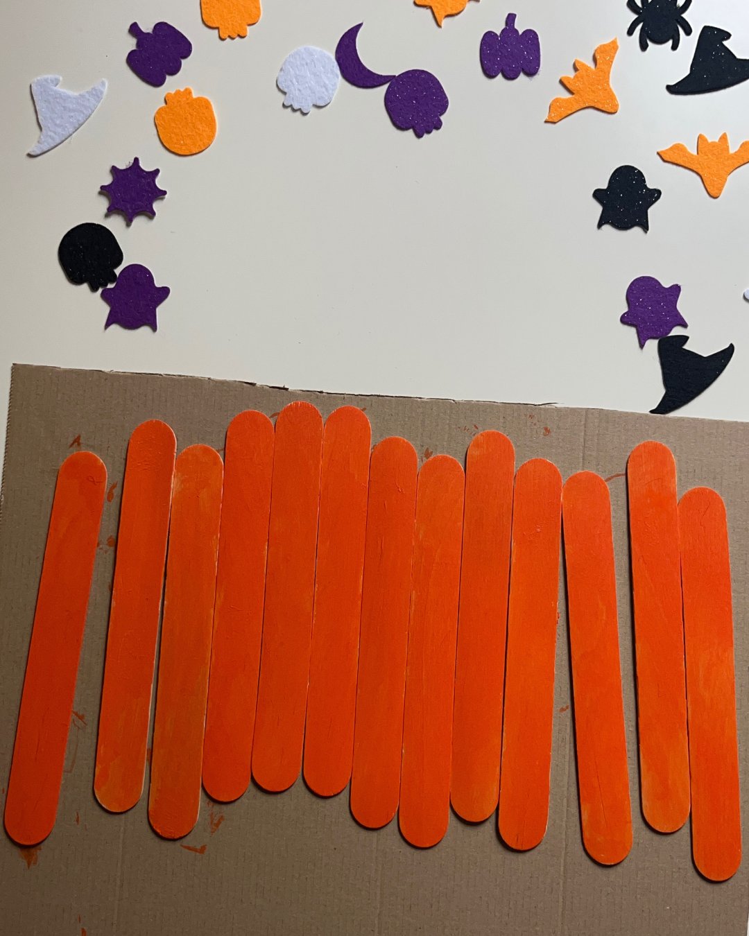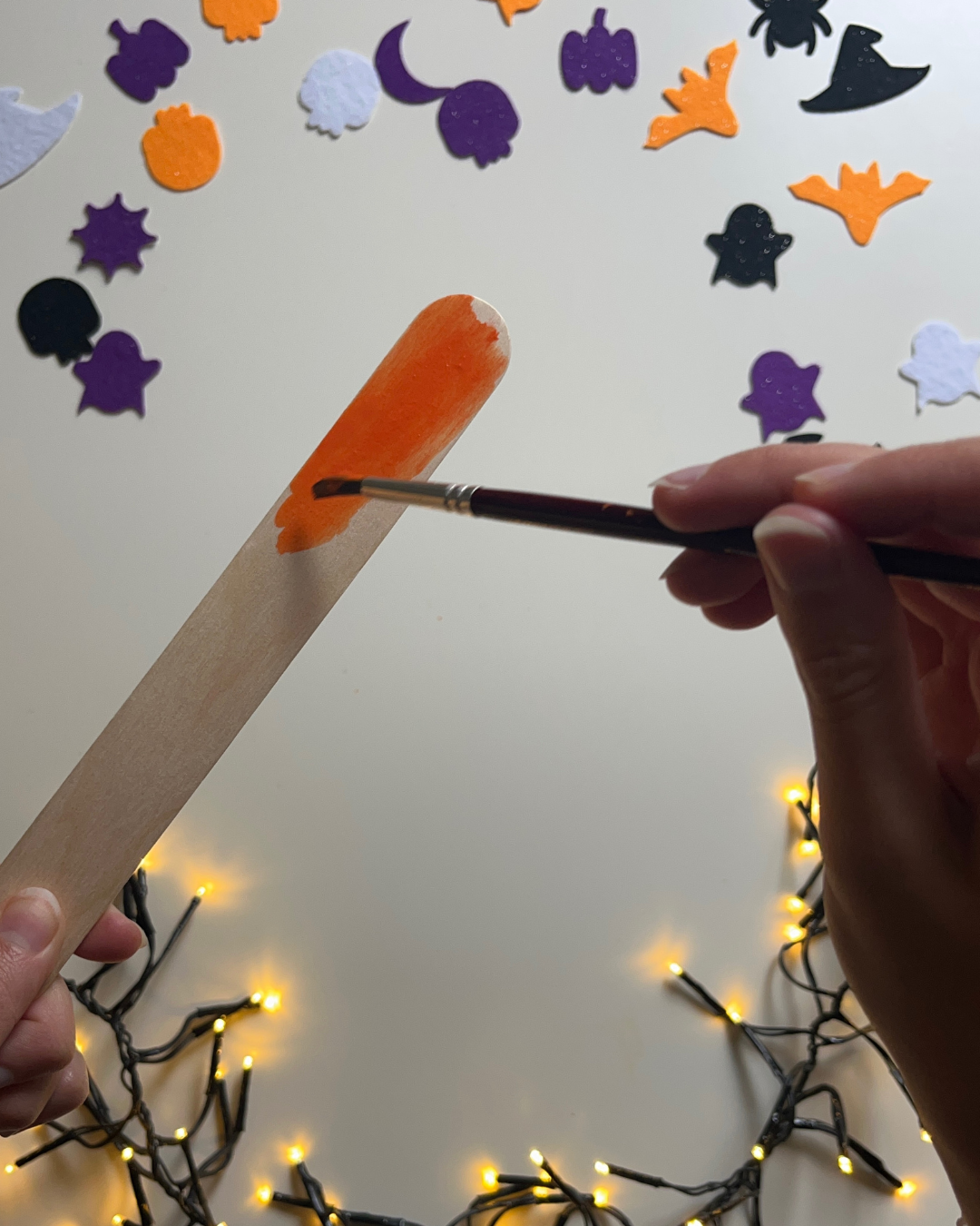 Laat je creatieve kapoenen eerst hun knutselstokjes schilderen in echte halloweenkleuren.