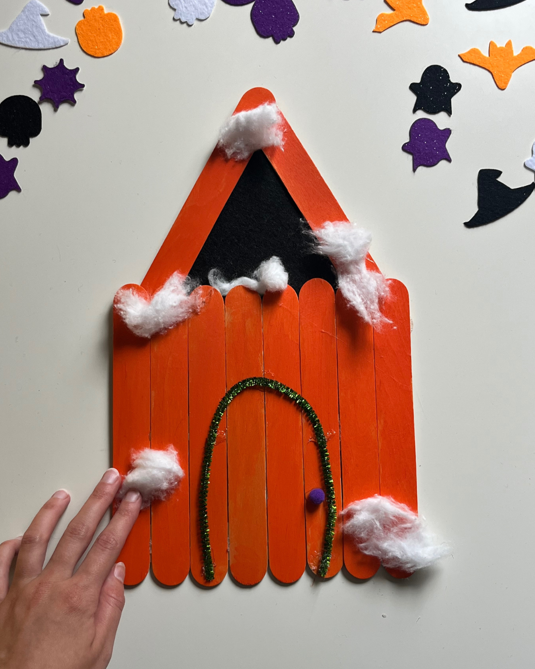 Gebruik samen met je leerlingen een lijmpistool (onder jouw begeleiding) om de geschilderde stokjes tot een stevig spookhuisje te lijmen. Stimuleer je groep om te experimenteren: een driehoekig dak, schuine torentjes of een volledig fantasiehuis.
