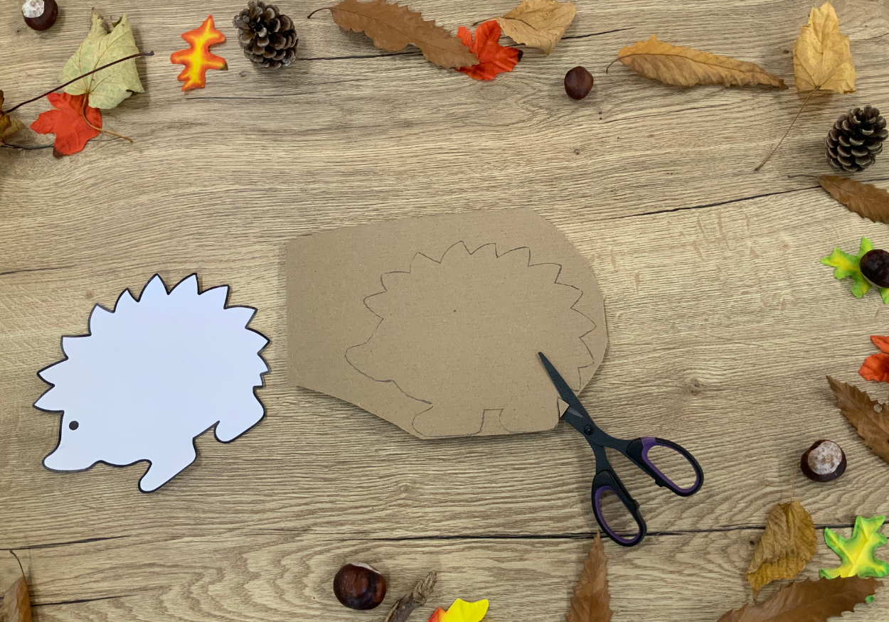 Laat je creatievelingen een sjabloon kiezen (egel of herfstblad) en druk deze af. Laat hen het sjabloon uitknippen en het vervolgens overtekenen op een stuk karton met een tekenpotlood. Daarna knippen ze de kartonnen vorm uit. Zo is er een stevige basis om straks te prikken en te rijgen!