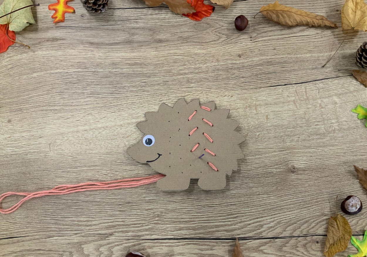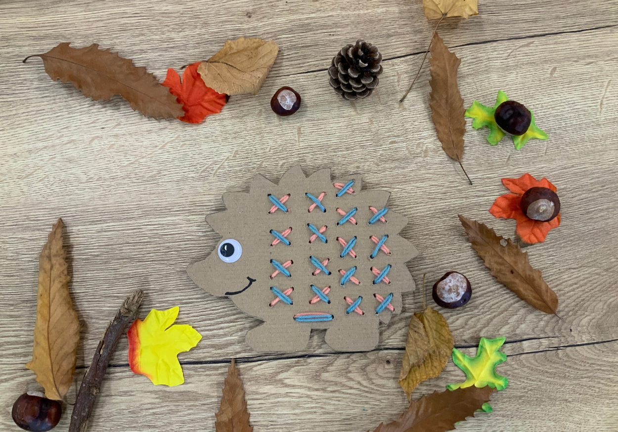 Laat je creatieve kapoenen een kleur wol kiezen en geef hen een stompe naald. Ze rijgen nu de draad door de gaatjes heen en maken zo hun eigen patroon op hun egel of blad. Rechte lijnen, kruisjes, zigzags… alles kan!