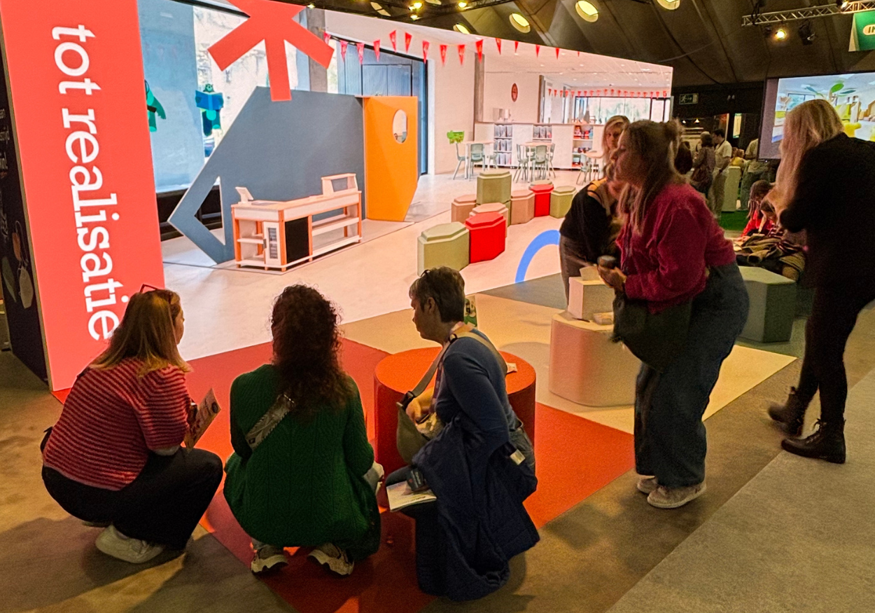 Ook onze handgemaakte poefjes trokken meteen de aandacht. Ze zorgden niet alleen voor een speels element op de stand, maar vormden ook de perfecte aanleiding voor gesprekken over flexibele klasopstellingen en praktische schoolinrichting.